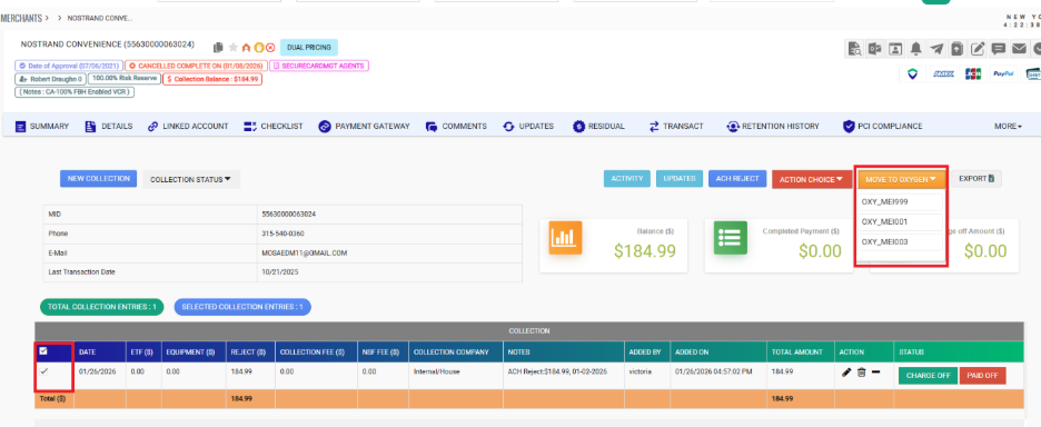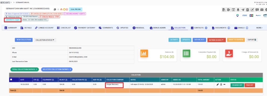 - Collection Ticket fully documented: "Balance over $100 send to Oxygen, uploaded documents - Emailed merch sent to Oxygen. Closed Collection Ticket."
