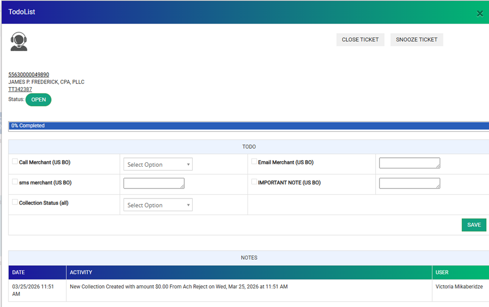 - Future automation: Any SMS, email, or settlement offer sent automatically should also create or append a comment in the Collection Ticket for proper tracking.